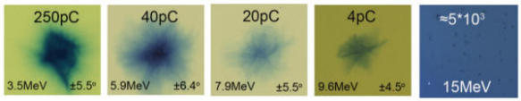 在国家重大仪器专项、重大科学问题导向项目(973A)、XXX专项和协同创新等项目的支持下,激光加速团队攻克了高对比度与高光强激光技术、自支撑纳米薄膜靶制备技术、超高流强离子束传输技术和激光加速器辐照研究平台等关键技术,最终建成世界上首台超小型激光加速器辐照装置(如图1所示),加速参数指标为1~15MeV质子束,总流强106-8个粒子/发。2017年激光加速器装置正式建成出束,并通过了同行专家的现场技术测试。实验中利用能谱仪、RCF和CR39,确认加速产生了能量1-15 MeV质子束(如图2所示),在加速稳定性测试实验中,进行了5发连打测试,显示质子截止能量的稳定性好于3%(如图3所示)。