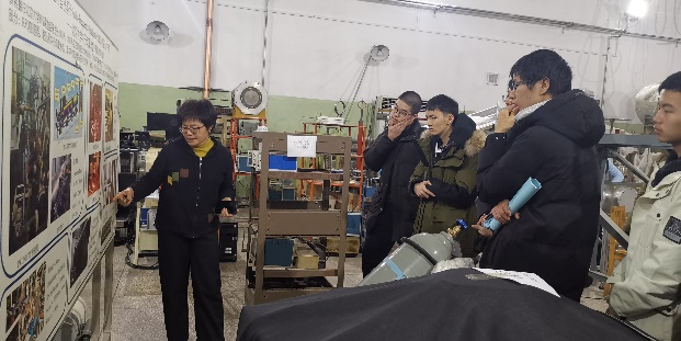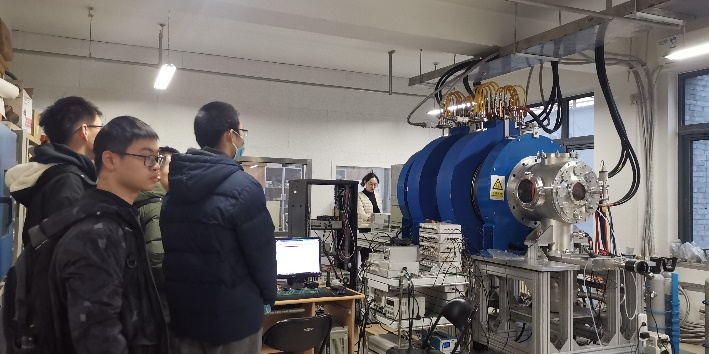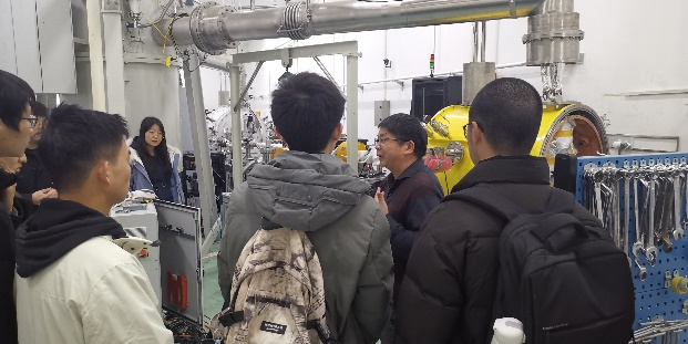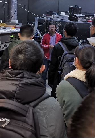 同学们在技物楼集合之后,首先参观激光等离子体实验室和射频超导加速器实验室。重离子所副所长、激光加速器实验室马文君老师接待并向同学们介绍了世界首台激光离子加速器,详细介绍了其中的拍瓦激光器及靶场实验装置。重离子所副所长、射频超导实验室黄森林老师整体介绍了超导电子加速器的发展历程和主要研究成果,并由五位博士生分别详细介绍了射频超导腔、2K液氦低温系统、激光驱动光阴极注入器、低能高压直流电子枪等超导电子加速器的关键研究环节。
