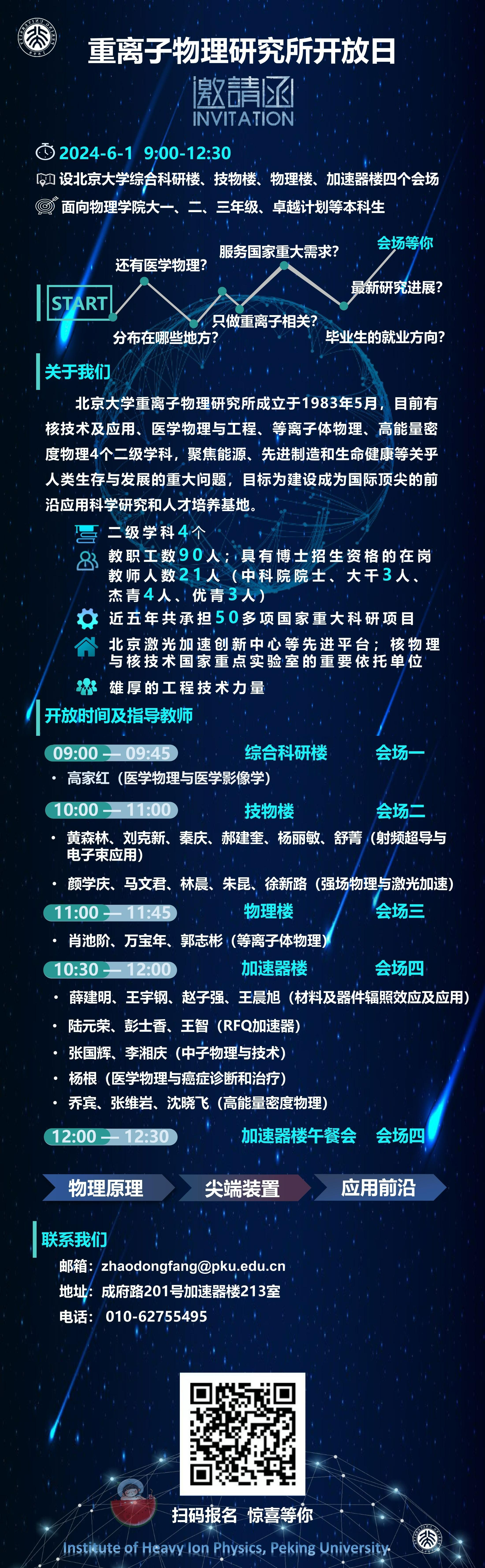 我们诚挚地邀请你们参加重离子物理研究所开放日活动。你将有机会现场参观我们的学习环境和实验装置,深入了解各位导师的研究课题并获得指导。开放日将设北京大学综合科研楼、技物楼、物理楼、加速器楼四个会场,各会场的具体活动细节会在开放日之前邮件通知。