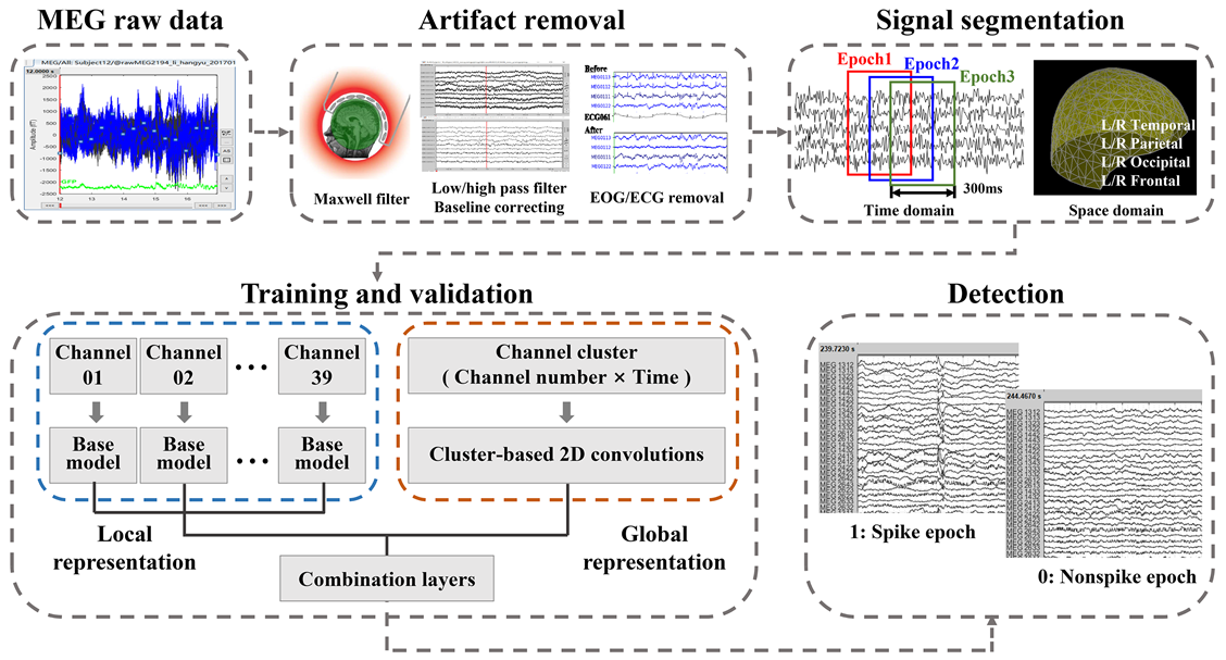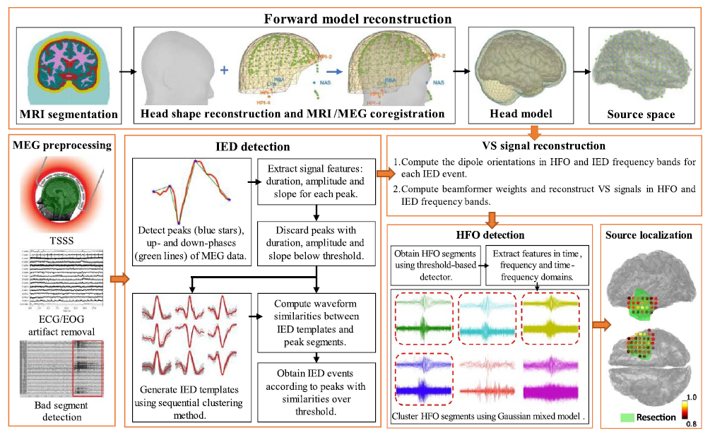 北京大学重离子物理研究所医学物理和工程北京市重点实验室从磁共振成像(MRI)、脑磁图(MEG)、脑电图(EEG)三个无创脑成像模态出发,针对传统MRI无法直接获得神经元电活动的信号、MEG和EEG溯源定位不准确和空间分辨率低等缺陷,发展了一系列能够快速精准探测癫痫异常放电位置的脑成像新方法。首先,实验室基于MEG发展了分布式溯源算法用于定位癫痫致痫灶,包括基于稀疏假设的eFast-VESTAL算法和融合MEG与SEEG两种模态优势的溯源算法SIMNE,研究结果表明新算法相比传统的溯源算法提升了对癫痫患者IED的定位精度;其次,实验室基于MRI开展了癫痫患者fMRI白质脑网络分析,探究癫痫患者的脑网络异常,从脑网络层面为致痫灶定侧提供依据;最后,实验室发展了基于同步记录fMRI 时变约束EEG源定位算法wFITC,进一步提高EEG溯源定位的准确性。实验室还构建了一个包含4083例癫痫患者和366例健康对照的癫痫多模态脑影像数据库,为后续发展和验证癫痫致痫灶定位脑成像新方法提供了数据基础。基于此数据库,实验室借助深度学习等人工智能技术发展了自动检测癫痫异常放电的算法,并发展了用于癫痫患者病理高频振荡信号的检测和定位一站式系统EMHapp,以及用于发作间期癫痫样放电信号的检测和定位工作流AMSI。