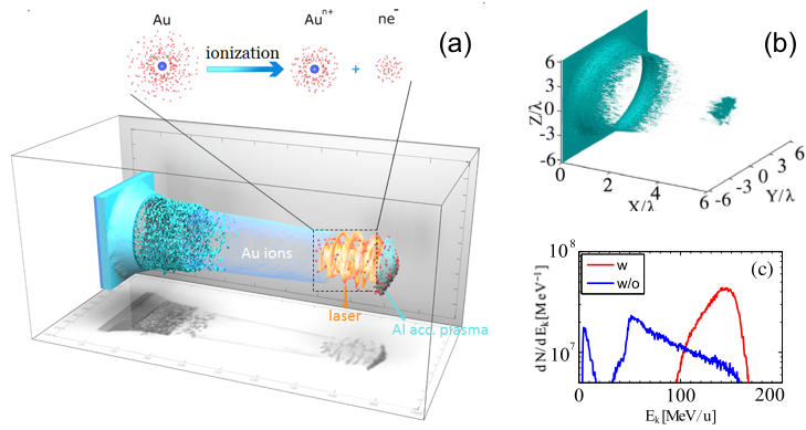 2016年,在RPA加速机制的基础上,团队提出了“离化动态致稳”辐射压加速新方案,解决了辐射压加速中不稳定性导致加速被过早破坏的难题。利用高Z涂层的连续电离效应动态地给被加速薄靶补充电子,维持其不透明性,进而抑制不稳定性的发展,实现了稳定的辐射压加速。采用1022W/cm2的激光辐照带有Au涂层的Al靶,理论上可以获得3.8GeV、粒子数为1010 (带电量大于20nC) 的准单能Al13+离子束。该项工作发表于Phys. Rev. Lett. 118, 204802 (2017)。