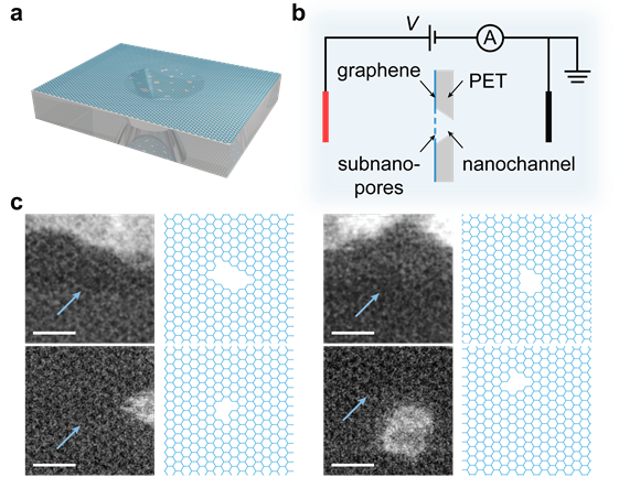 石墨烯异质纳米通道结构示意与石墨烯亚纳米孔扫描透射电子显微镜图像