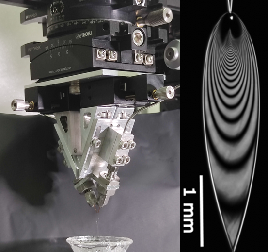 超薄液体薄膜靶系统(左)与液膜表面的干涉条纹(右)