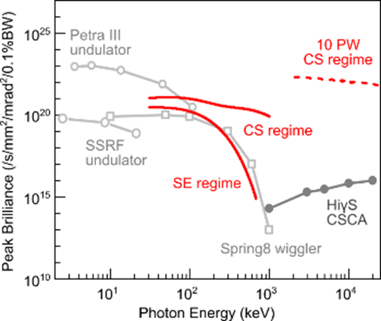 基于碳纳米管靶的X射线光源与其它大型光源的峰值亮度对比。SSRF、PetraIII、Spring8分别是正在运行的位于上海、德国、日本的大型同步辐射光源。