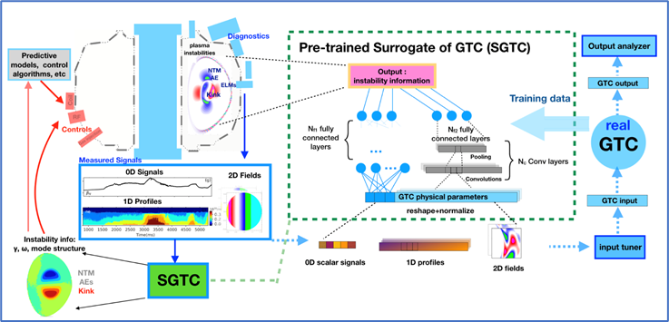 林志宏老师组将机器学习方法结合到课题开发的回旋动理学程序,并利用实验上的诊断信息来实现对燃烧等离子体可能出现的不稳地模式(例如阿尔芬本征模)的预测(Nuclear Fusion, 61, 126061 (2021))。