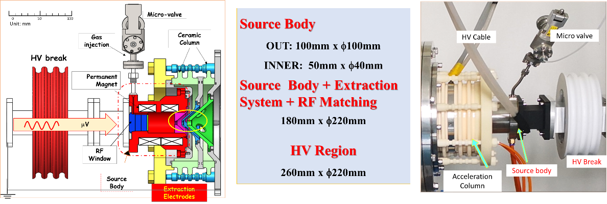 从2016年起,课题组开始了微型强流2.45 GHz ECR离子源的理论和实验研究,研制成功了一体化微型离子源。源体的放电室尺寸为40 mm×f30 mm,整个离子源(含源体、水冷45 kV三电极引出系统,微波耦合等)的外围尺寸为f 180mm × 140mm,微波传输系统从传统的矩形波导换成了同轴线。氢气放电结果表明,该源在脉冲模式下可以产生64 mA(1.8 kW)氢混合束,在直流模式下产生了32.4 mA(100 W),其在直流模式下微波功率效率远高于一般直流质子源的10mA/100W的结果。该源已经在小型中子源和半导体离子注入机中得到了很好的应用。