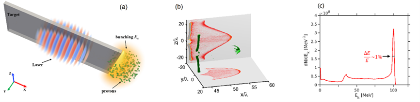 2020年,团队进一步提出利用拍瓦飞秒强激光辐照微带靶获得单能高品质离子束的离子加速新方案。利用激光剥离微带靶电子而激发起的纵向表面等离子体波加速电子并在靶后建立纵向加速场和横向聚焦场,进而获得准单能离子束。采用强度为7.8×1020 W/cm2、能量为50J的飞秒激光,理论上可得到能量超过100MeV,能谱展宽约为1%,粒子数目为109的单能质子束。该工作发表于Phys. Rev. X, 11, 041002 (2021)。