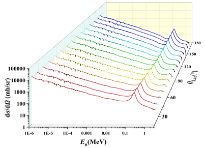 面向先进核能系统,中子物理团队与Dubna联合核子研究所、原子能科学研究院、高能物理研究所等单位合作,基于北京大学4.5 MV静电加速器中子源、原子能院HI-13串列加速器中子源、中国散裂中子源Back_n白光中子源,对一系列轻核、中重核和重核(1,2H, 6Li, 10B, 12C, 14N, 16O, 25Mg, 35Cl, 39K, 40Ca, 54,56,57Fe, 58,60,61Ni, 63Cu, 64,66,67Zn, 95Mo, 143,144Nd, 147,149Sm, 232Th)的中子诱发带电粒子出射核反应进行了实验测量与理论分析,获得了可靠的实验结果。迄今已有60个核反应、107套核反应数据被国际原子能机构(IAEA)核反应实验数据库EXFOR收录(本实验室在库中的专用代码为“CPRBJG”)。在PRL、PRC、CPC、EPJA等期刊发表研究论文100多篇。其中,149Sm(n,)反应测量,精确测得了小到50微靶的反应截面,相关研究工作发表在PRL上;10B(n,t+2)多体核反应实验结果对澄清已有数据分歧起到了重要作用,对认识多体反应具有重要意义;在4~11MeV中子能量区,测量了54,56,57Fe, 58,60,61Ni, 64,66,67Zn等(n,α)反应截面,发现其激发函数中均存在“肩效应”,通过分析能量微分截面,发现了明显的非统计效应;基于白光中子源,在很宽的中子能区对6Li(n,t)、10B(n,α)、n-p散射微分截面进行了测量,实验结果的系统性和精度位于国际前列,得到了国际原子能机构(IAEA)标准数据专家组的高度评价和认可,被认为是近年来标准截面测量的主要进展,为新一轮国际标准截面数据评价提供了重要依据。