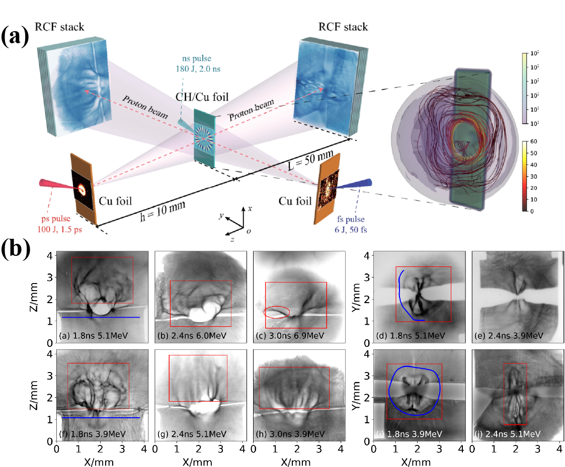 2019-2021年,依托世界上唯一的同时具有纳秒、皮秒和飞秒激光脉冲的星光-Ⅲ装置,利用TNSA加速机制驱动高品质质子源,开展了各向异性热等离子体中自生磁场的三维同步质子照相系列研究。首次获得了低原子序数CH和高原子序数Cu等离子体自生磁场的三维结构实验数据,并且同时观察到了流体的Biermann和动理学的Weibel这两种最重要的宇宙种子磁场机制,揭示了库仑碰撞对磁场产生的重要影响。该技术入选国家“十三五”科技成果创新成就展,是“超强激光在高温高密度极端物质科学中的先进诊断技术”成果的主要内容之一,也是获得“国防科技工业突出贡献奖(团队奖)”的主要内容之一。