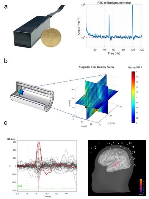 a.高性能小型化原子磁强计外观(左)及本底噪声(右);b.磁屏蔽装置示意图及内剩余磁场测量结果;c.听觉诱发脑磁信号测量结果(左)及初级听觉皮层定位结果(右)